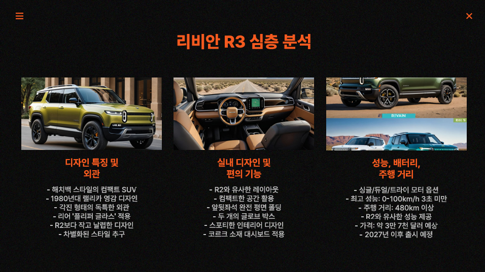 리비안 R2, R3, R3X는 각기 뚜렷한 특징과 타겟 고객층을 가진 매력적인 전기 SUV 모델입니다. R2는 넓은 실내 공간과 다양한 활용성을 바탕으로 가족 단위 소비자나 넉넉한 공간을 원하는 소비자에게 적합합니다. R3는 개성적인 해치백 디자인과 합리적인 가격으로 젊은 소비자층을 공략하며, R3X는 강력한 성능과 스포티한 디자인으로 다이내믹한 주행 경험을 추구하는 소비자에게 최고의 선택이 될 것입니다.