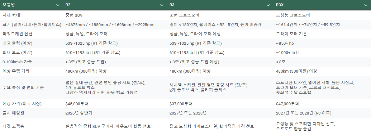 리비안 R2, R3, R3X는 각기 뚜렷한 특징과 타겟 고객층을 가진 매력적인 전기 SUV 모델입니다. R2는 넓은 실내 공간과 다양한 활용성을 바탕으로 가족 단위 소비자나 넉넉한 공간을 원하는 소비자에게 적합합니다. R3는 개성적인 해치백 디자인과 합리적인 가격으로 젊은 소비자층을 공략하며, R3X는 강력한 성능과 스포티한 디자인으로 다이내믹한 주행 경험을 추구하는 소비자에게 최고의 선택이 될 것입니다.