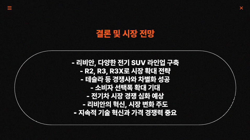 리비안은 R2, R3, R3X의 다양한 라인업 구축을 통해 전기차 시장의 여러 세그먼트를 효과적으로 공략할 수 있을 것으로 전망됩니다. 기존의 프리미엄 이미지를 유지하면서도 더 많은 소비자들이 접근할 수 있는 가격대의 모델을 출시함으로써, 리비안은 전기차 시장에서의 경쟁력을 한층 강화하고 지속적인 성장을 위한 발판을 마련할 수 있을 것입니다.