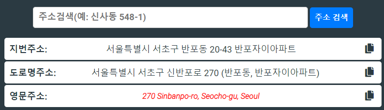 확인된 영문주소는 "270, Sinbanpo-ro, Seocho-gu, Seoul" 이렇게 확인됩니다. 우편번호와 관할 주민센터까지 알 수 있게 되었습니다.