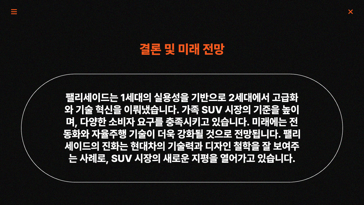 1세대는 탄탄한 기술 및 안전 기능 기반을 제공했으며, 캘리그래피 트림 도입은 더욱 고급스러운 포지셔닝으로 나아가려는 움직임을 보여주었습니다. 다양한 안전 및 편의 기능들이 제공되었으며 , 캘리그래피 트림의 긍정적인 반응 은 현대자동차가 팰리세이드의 고급스러운 버전에 대한 수요를 인식하고 전략적으로 이 세그먼트에 집중했음을 시사합니다.