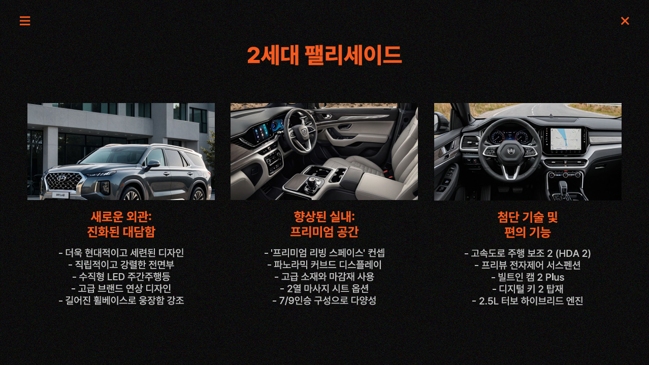1세대는 탄탄한 기술 및 안전 기능 기반을 제공했으며, 캘리그래피 트림 도입은 더욱 고급스러운 포지셔닝으로 나아가려는 움직임을 보여주었습니다. 다양한 안전 및 편의 기능들이 제공되었으며 , 캘리그래피 트림의 긍정적인 반응 은 현대자동차가 팰리세이드의 고급스러운 버전에 대한 수요를 인식하고 전략적으로 이 세그먼트에 집중했음을 시사합니다.
