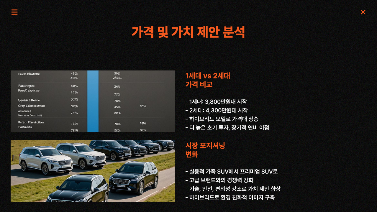 2세대 디자인은 1세대의 순수한 실용적인 느낌을 넘어 더욱 고급스럽고 세련된 외관을 목표로 합니다. 디자인 요소들이 고급 브랜드에서 영감을 받은 것은 시장 포지셔닝의 변화를 나타냅니다. "웅장하고 독창적인 디자인"과 "더욱 견고하고 고급스러워진 디자인"을 반복적으로 언급하는 것을 통해 이를 알 수 있습니다 . 특히 레인지로버와의 직접적인 비교 는 현대자동차가 팰리세이드의 인지된 품질을 높이고 더욱 까다로운 고객층에게 어필하려는 의식적인 노력이 있었음을 시사합니다.