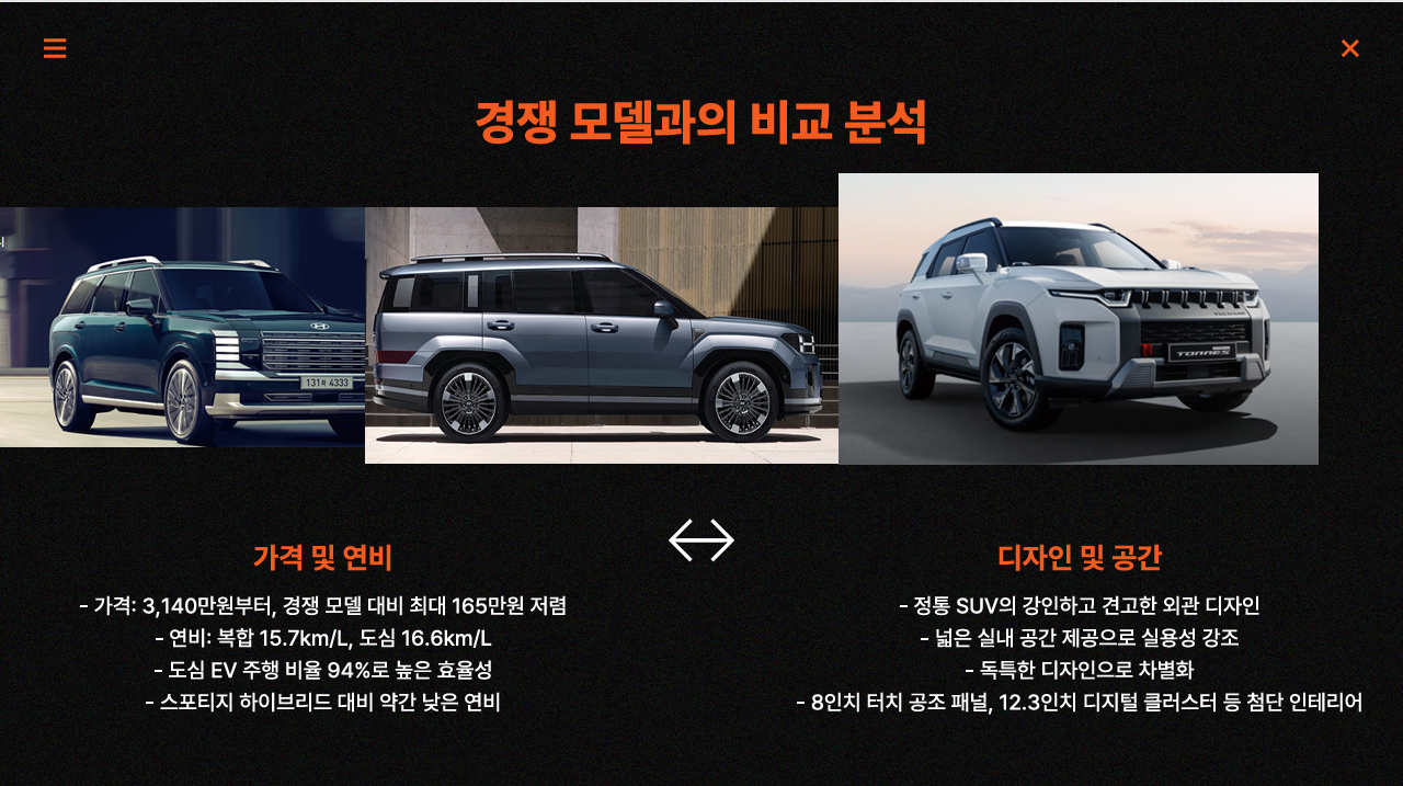 KG 모빌리티 토레스 하이브리드는 기존 가솔린 모델의 디자인 아이덴티티를 그대로 계승하여 정통 SUV의 강인하고 견고한 외관을 자랑합니다 . 이는 날렵하고 미래지향적인 디자인을 선호하는 최근 SUV 트렌드와는 차별화되는 요소로, 전통적인 SUV 스타일을 선호하는 소비자들에게 매력적인 선택지가 될 수 있습니다.
